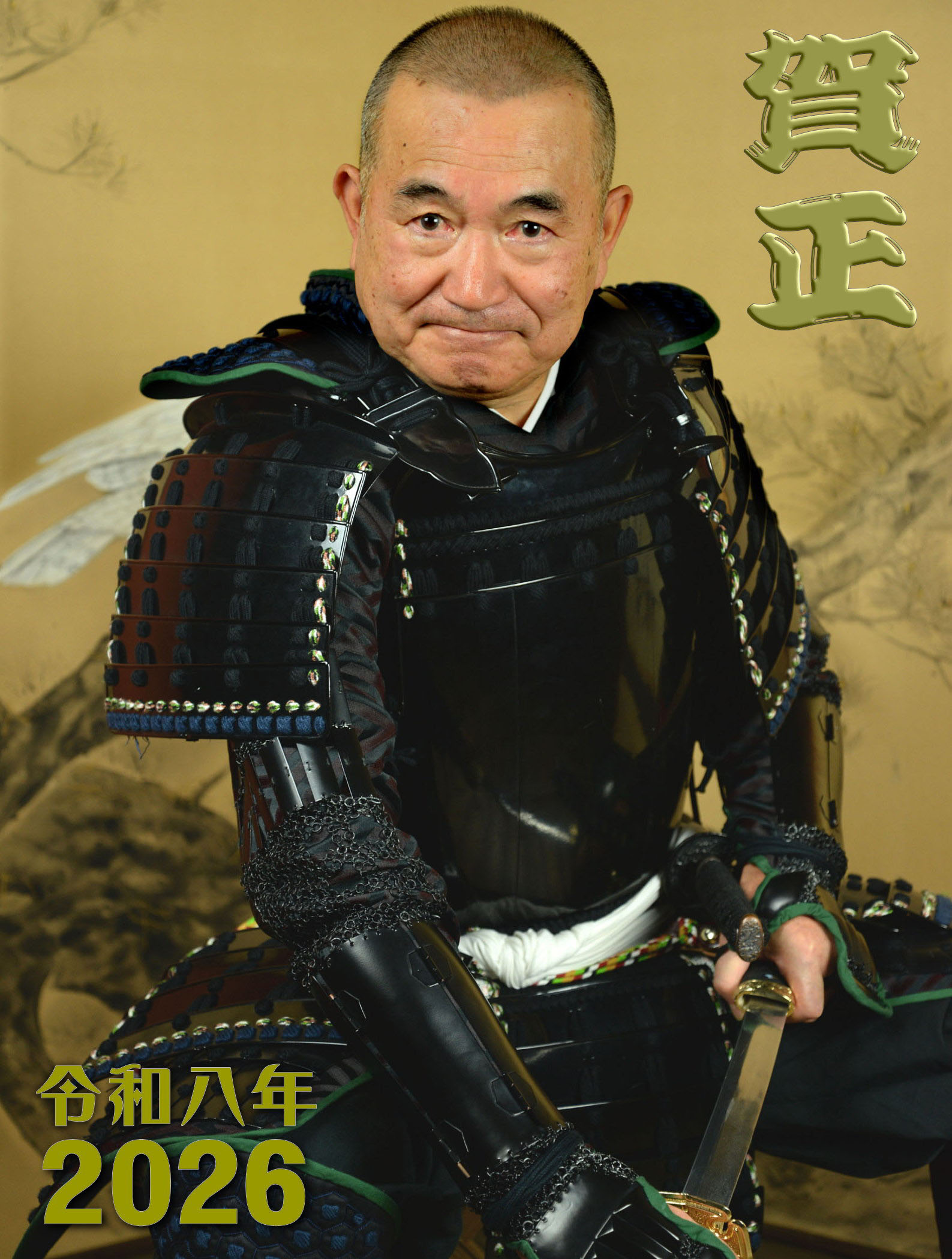 令和8年(2026)、60年に一度巡ってくる丙午(ひのえうま)の年頭に当たり、伊達政宗の甲冑を身に着けた写真で年賀状をつくりました。